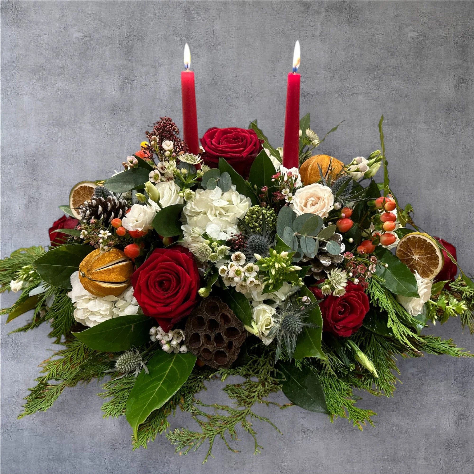 A gorgeous Christmas centerpiece showcasing vibrant red roses and fluffy white hydrangeas, perfectly arranged for a festive table. The rich blooms are complemented by lush green foliage, including eucalyptus, bay, cypress and sprigs of pine, and two elegant red candles evoking the essence of the season. Accents of red berries, silvery pinecones, and dried oranges, add a touch of holiday glamour.