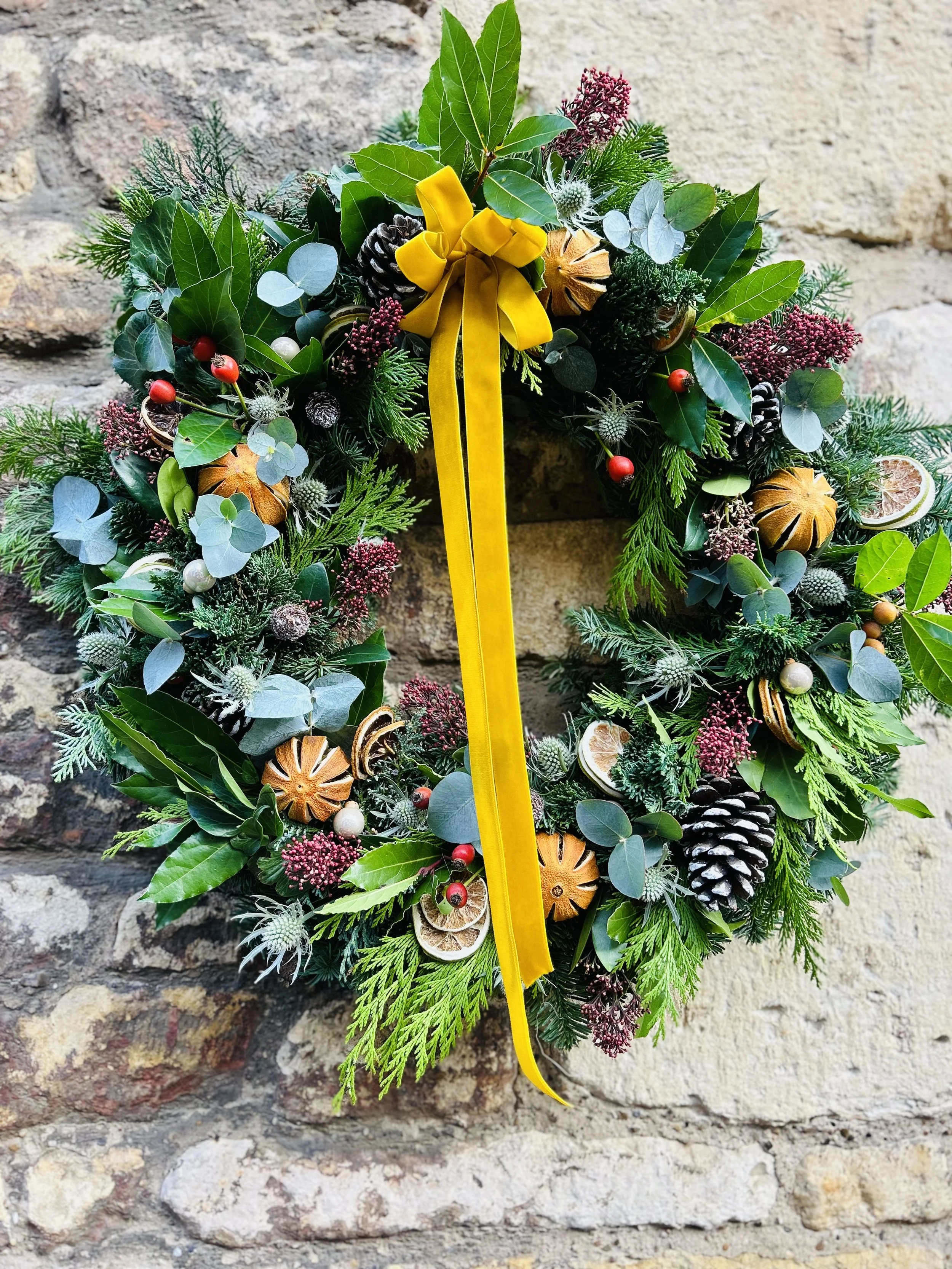 Welcome the festive season with our luxurious mixed-foliage Christmas wreath, lovingly handcrafted to bring natural charm to your home. Bursting with fresh evergreens, textured foliage, and seasonal accents, each wreath is unique, full, and beautifully fragrant. Our beautiful handmade wreathes are a perfect way to say βwelcome to our homeβ over the festive season. Made in our little shop on Steep Hill this wreath is filled with a mixture of foliage, berries, oranges, and limes, cones and eryngium. Finished with a lovely velvet ribbon in mustard, red. or green